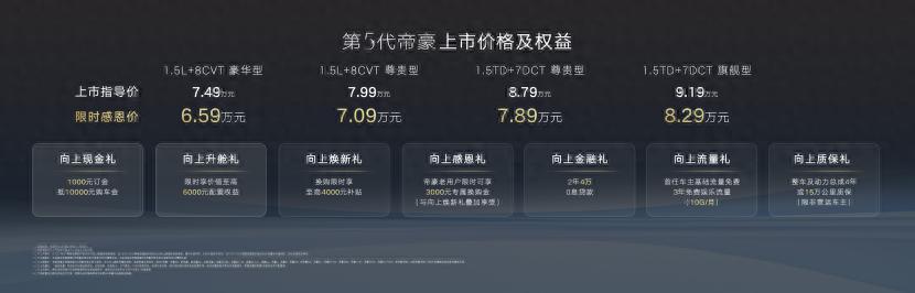 第5代帝豪提供1.5TD+7DCT与1.5L+8CVT双动力组合,满足不同用户需求。1.5TD发动机零百加速7.9秒,百公里油耗低至5.95L,实现性能与油耗的完美平衡。